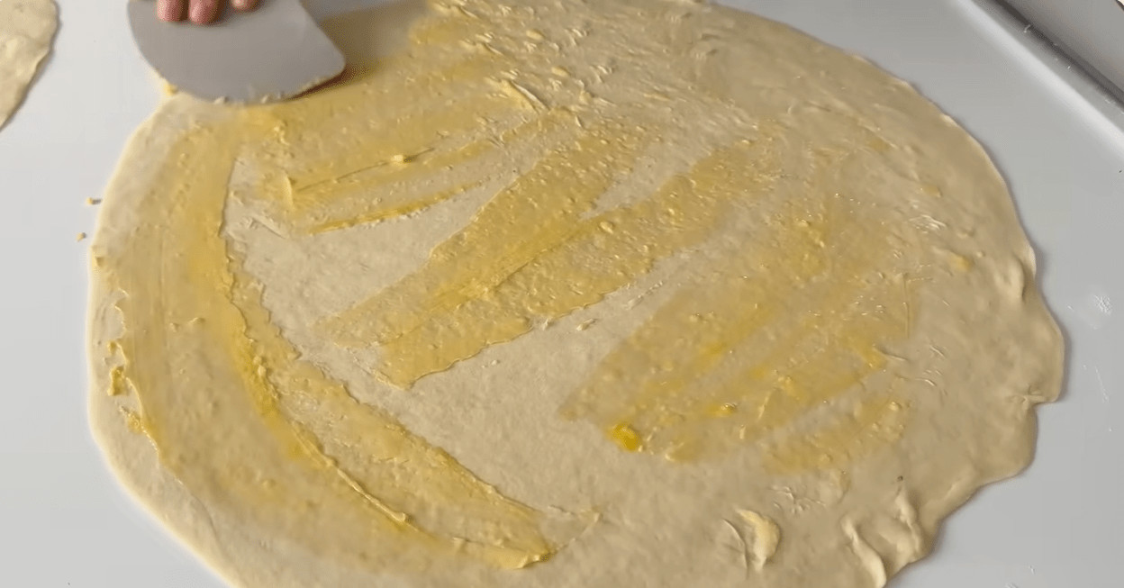 Svaku kuglu tijesta razvaljajte u krug promjera od 40 do 45 cm. Prvi krug stavite na radnu površinu i premažite ga mekanim puterom. Na njega stavite drugi krug tijesta i ponovo premažite puterom. Ovaj postupak ponovite i za treći sloj. Bitna stvar kod ovog postupka je da se puter ravnomjerno rasporedi kako bi se postigli savršeni slojevi. Dobijeni složeni krug podijelite na 8 jednakih dijelova, nalik na rezanje pice. Pažljivo složite dijelove jedan na drugi da dobijete viši sloj tijesta. Nakon toga, stavite tijesto u zamrzivač na oko 20 minuta. Hlađenje će učvrstiti puter, olakšati dalju obradu, a također će pomoći da slojevi ostanu lijepo odvojeni tokom pečenja. Ovaj korak je često zanemaren, ali je izuzetno važan za postizanje savršenog lisnatog efekta.