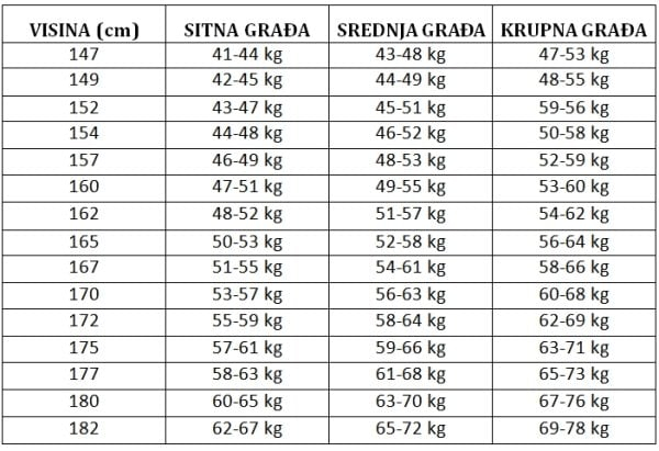 - 25–40 godina: prosjek 62,5 kg; vitka građa: 56,5 kg, srednja građa: 62,5 kg, krupnija građa: 68,5 kg. Preporuka: raznovrsna prehrana, manje masnoća i slatkiša, tjelovježba 3 puta tjedno.
