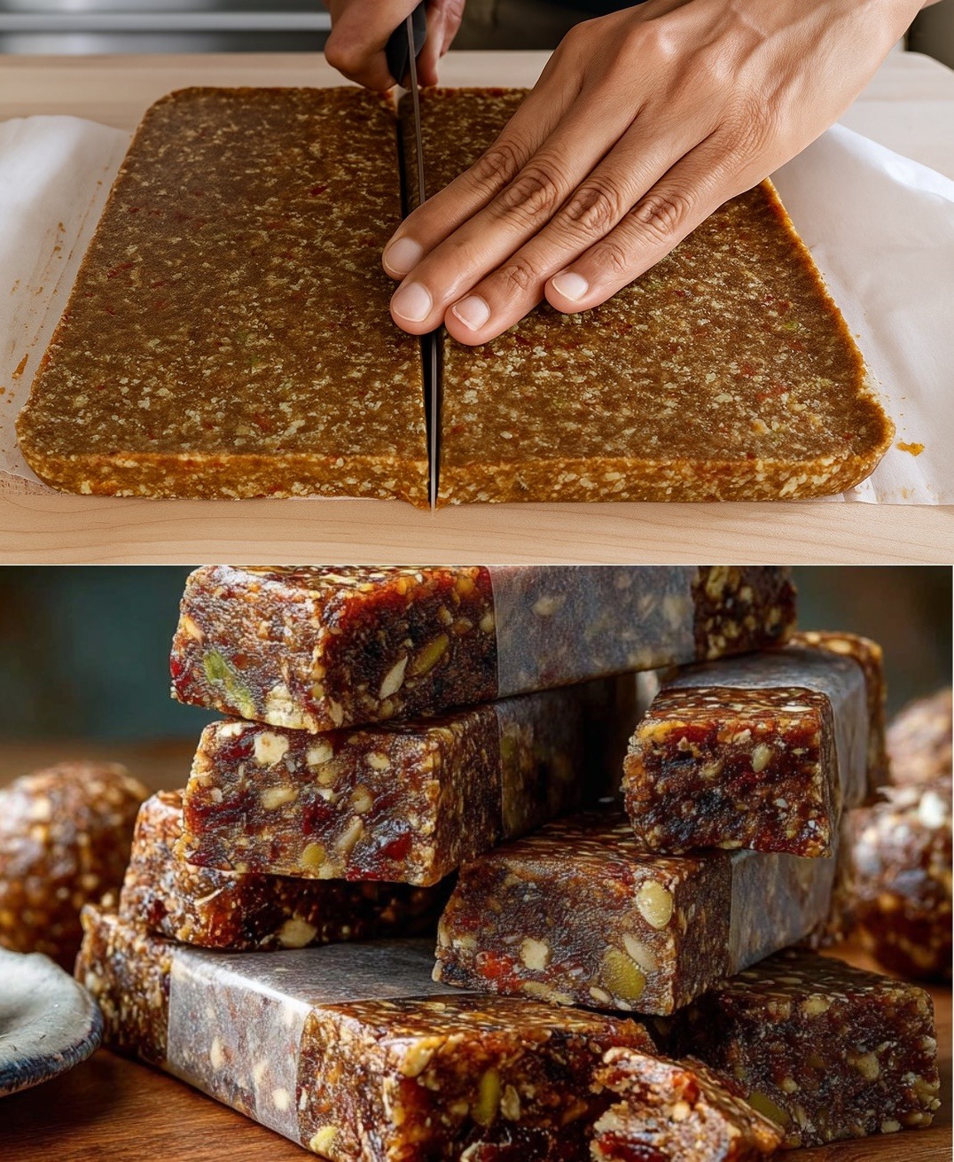 - Rezanje i skladištenje: Nakon što se smjesa ohladi u frižideru, izrežite je na štapiće i čuvajte u hermetički zatvorenoj posudi. Ove pločice možete čuvati do 4 tjedna, što ih čini savršenim izborom za brze užine.