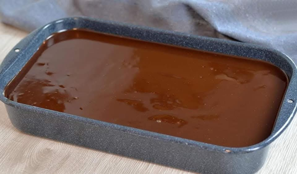 Dok se biskvit hladi, pripremite kremu. U šerpi na laganoj vatri zagrijavajte slatko vrhnje, čokoladu i šećer, miješajući sve dok ne provri. Ova krema je pravi raj za ljubitelje čokolade; bogata je, kremasta i jednostavna za pripremu. Kada kremu skuhate, prelijte je preko ohlađenog biskvita. Prije nego što to učinite, biskvit izbockajte vilicom na nekoliko mjesta kako bi krema mogla prodrijeti u tijesto. Ova tehnika omogućava da se svi okusi sjedinjuju i da biskvit upije slatku kremu.