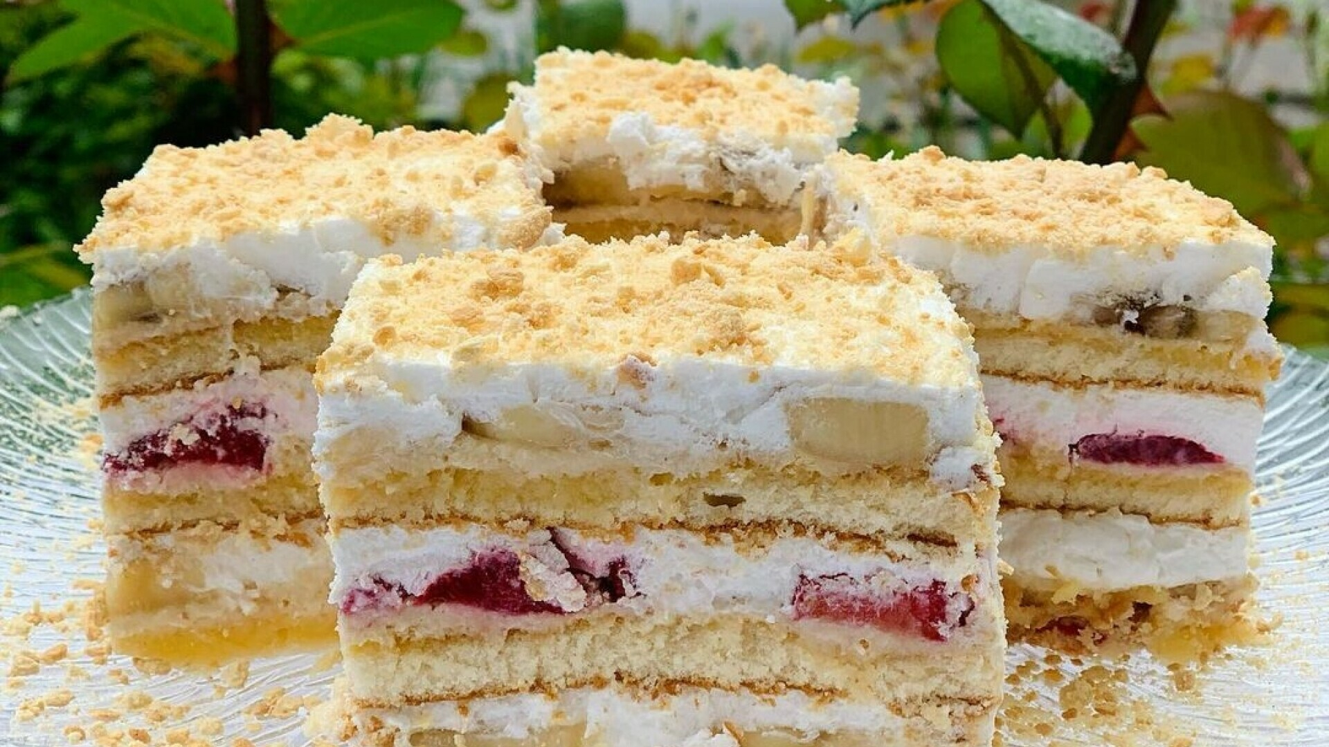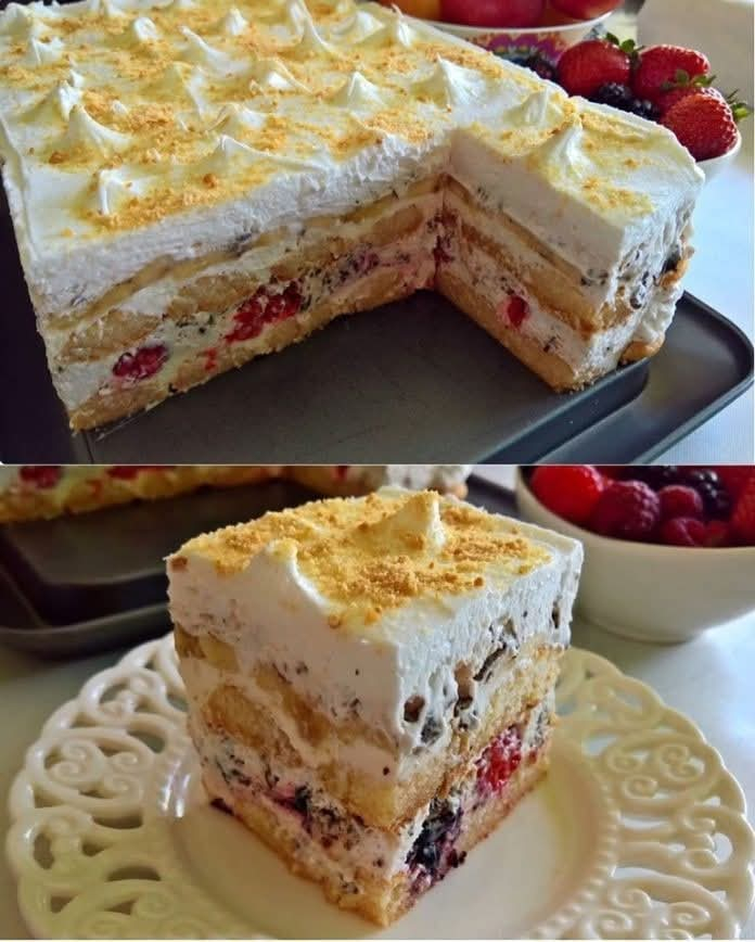Kao završni dodir, prelijte preostalu smjesu šlaga preko cijele poslastice. Ovo će dati lijepu, kremastu završnicu te će zapečatiti sve okuse unutar deserta. Dekorirajte po želji; možete koristiti mljevenu plazmu, orahe ili lješnike za dodatni hrskavi element. Ova dodatna hrskavost će dati kontrast mekanoj kremi i voću, čineći desert još privlačnijim. Preporučuje se da desert ostavite u frižideru najmanje nekoliko sati, a najbolje bi bilo da odstoji preko noći. Na taj način će se svi okusi savršeno sjediniti, a desert će dobiti savršenu teksturu. Kada odlučite poslužiti, jednostavno ga izrežite na porcije i uživajte!Ovaj desert je savršen izbor za sve ljubitelje slatkog koji žele nešto što je lagano i kremasto. Uz to, možete ga prilagoditi prema vlastitim željama dodavanjem različitih voćnih kombinacija ili čak različitih vrsta čokolade. Također, za ljubitelje egzotičnog okusa, predlažemo dodavanje malo kokosovog brašna ili karameliziranih orašastih plodova. Uživajte u pripremi i još više u degustaciji!